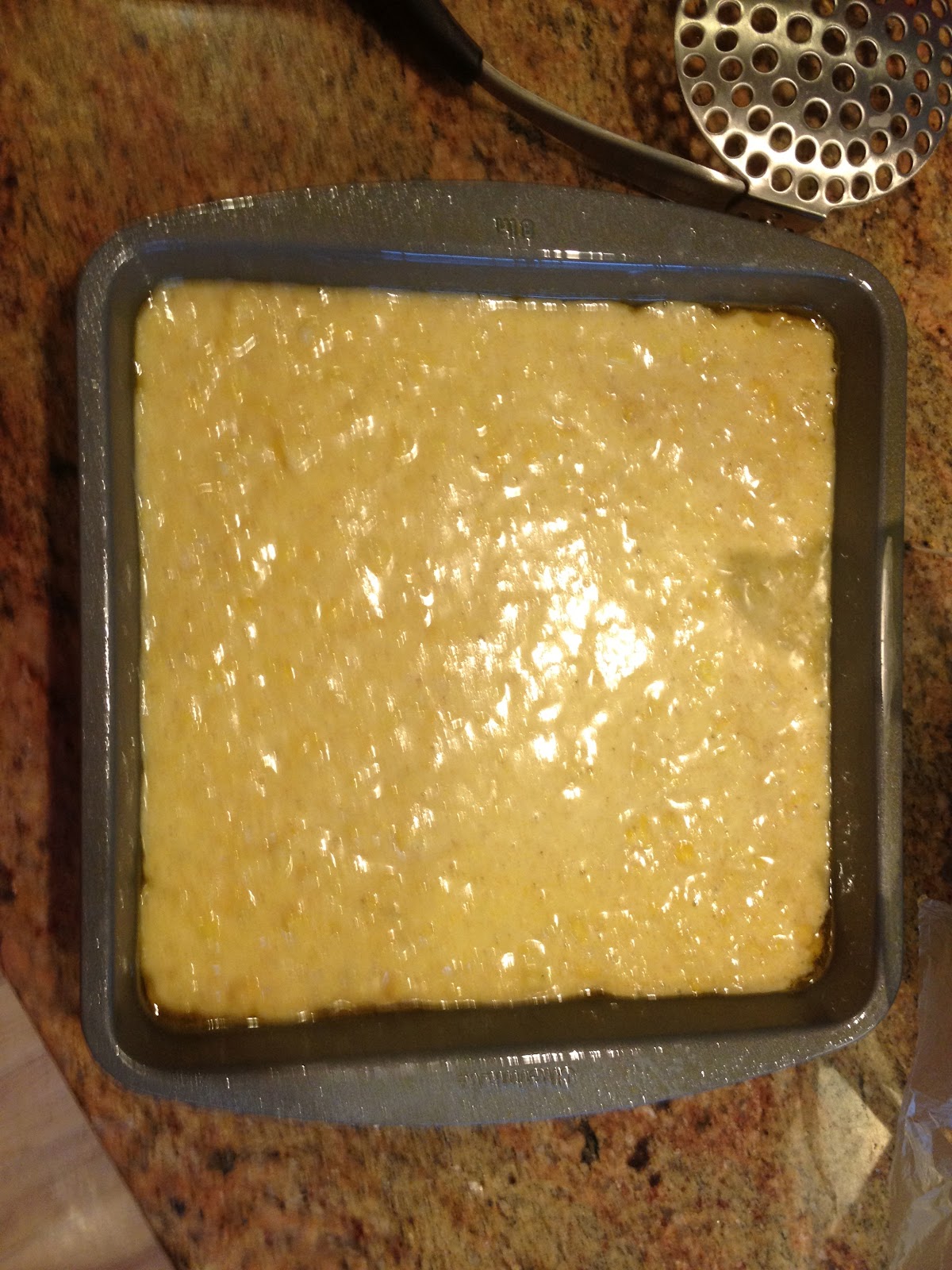 All you do, is take all the ingredients and put them into a bow and mix. Once again, I did this with my hands b/c it is just one less utensil to deal with and it just always seems to work much better anyway. Once the mixture is fully mixed, pour into a pre-greased pan. I used 8x8 but you can probably use 9x9 or even make muffins out of them. I put a little more cornmeal so make it more like a cornbread since I had planned on saving the majority for the next day's dinner. I knew Eric and I wouldn't even come close to eating this whole pan. With more cornmeal, I felt it would hold up better as leftovers. You can also choose to use less cornmeal to make more of a soufflé or pudding texture.